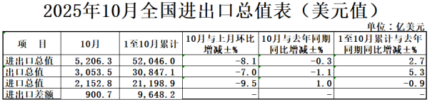2025年前1-10月,我国货物贸易进出口37.31万亿元人民币,同比增长3.6%。其中,出口22.12万亿元,增长6.2%;进口15.19万亿元,与去年同期基本持平