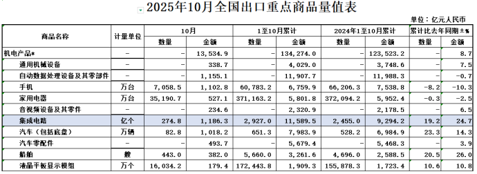 2025年前10个月重要外贸数据一览