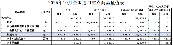 2025年1-10月,我国出口集成电路11589.5亿元,增长24.7%;进口集成电路24603.9亿元,增长9.9%