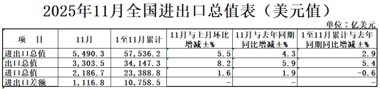 2025年前11个月,我国货物贸易进出口总值41.21万亿元人民币,同比增长3.6%。其中,出口24.46万亿元,增长6.2%;进口16.75万亿元,增长0.2%。